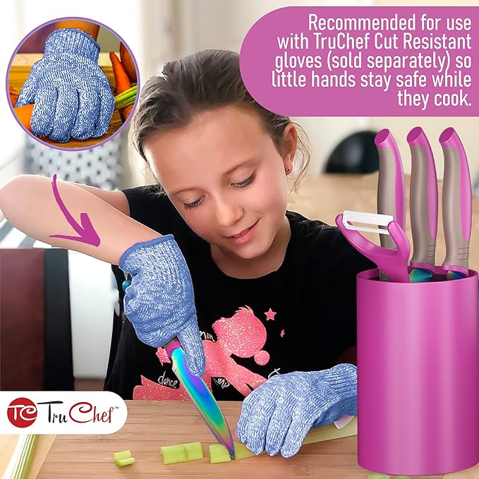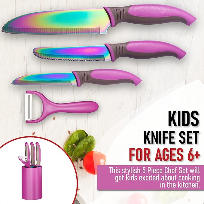 - 🎁 All-in-One Set That Grows with Them: Includes a kids chef knife, paring knife, serrated knife, ceramic peeler, and a universal holder—everything they need to get started. A thoughtful pick for cooking sets for teens, girls, or any aspiring young chef.