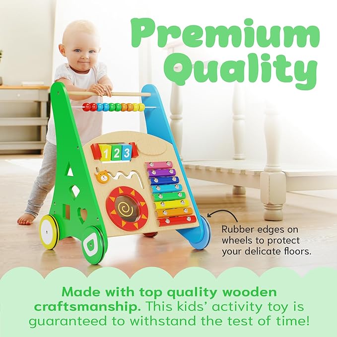- SPECIAL SAFETY FEATURE: This kids’ activity toy has an Adjustable Speed Feature for just starting to-walk Toddlers, It is Made with top-quality wooden craftsmanship, rubber edges on wheels that protect your delicate floors, and non-toxic paints!