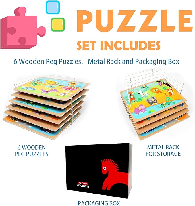 - 🧩TODDLER PUZZLES WITH STORAGE RACK: WOOD CITY Peg Puzzle Sets includes 6 pack wooden puzzles of different themes as well as a puzzle shelf to keep the wood puzzles within easy reach and maintain your playroom tidy by this metal puzzle rack.