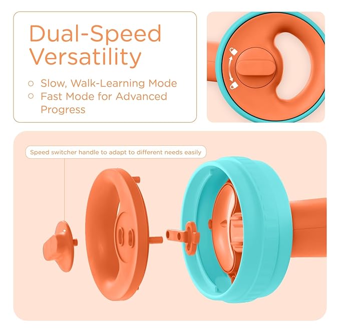 - ๐๐๐ฃ๐ฎ๐ฌ๐ญ๐๐๐ฅ๐ ๐๐ฉ๐๐๐: This baby walker with wheels has a two-speed control switch on the rear wheels to grow with the babies' steps, and the rear wheels applied antislip strips increase friction with the ground, avoiding "overspeed" or "out of control"