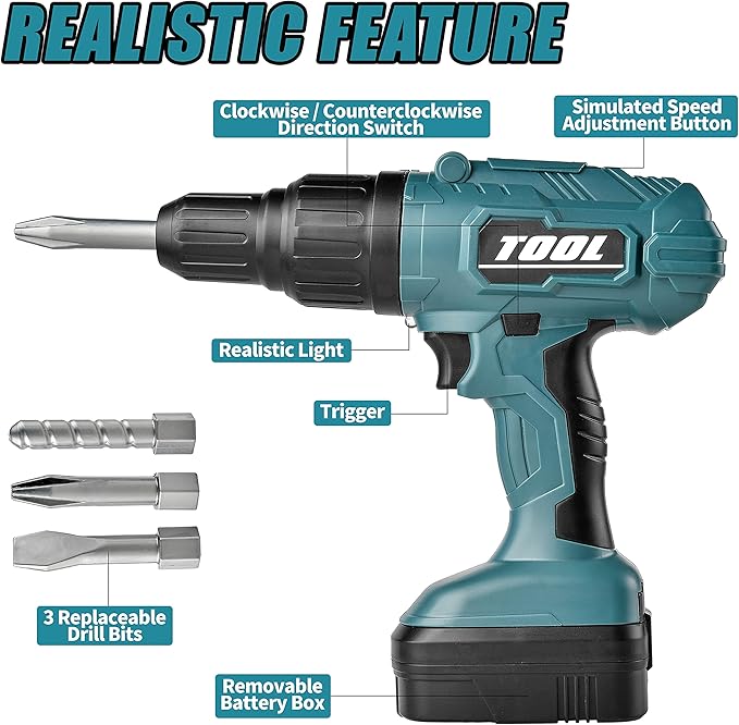 - 【Realistic Features】 This electric drill is equipped with three replaceable drill bits with different functions. And it has three states, you can choose two directions of rotation clockwise and counterclockwise, you can also maintain the drill stationary. When the electric drill is working, the drill bit will rotate and with the adjustable light which just likes a real tool.