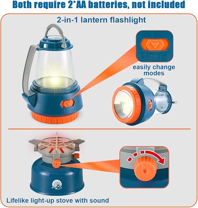 - LIFELIKE 2-IN-1 FLASHLIGHT-LANTERN AND CAMPING STOVE: The flashlight could light up bright for kids camping needs or playing in the backyard, it could easily change to lantern with just a slide of the button. The little camping stove could light up with realistic sound makes pretend play games almost like real. Both require 2 AA batteries(Not included)