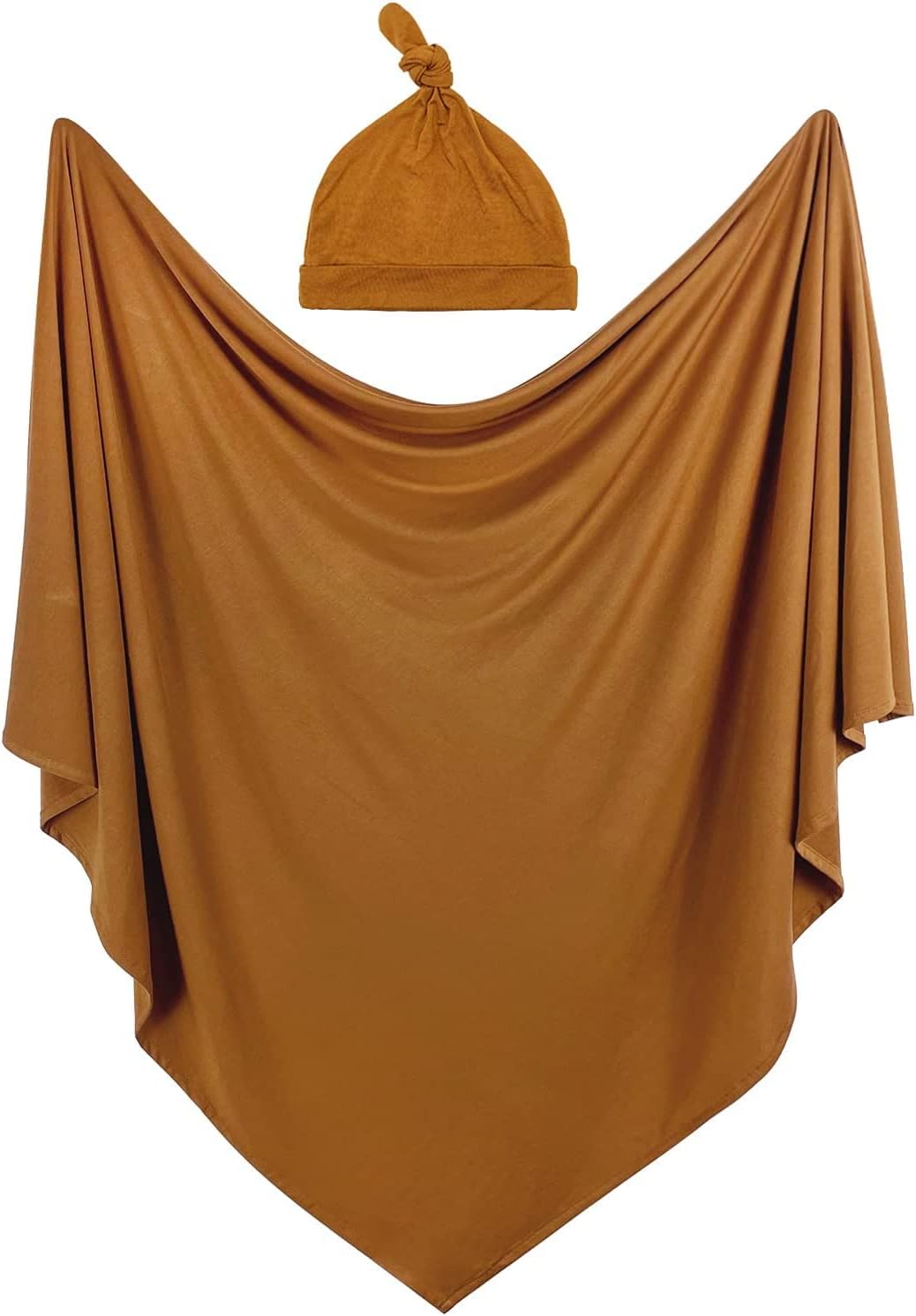 iEvolve Cotton Knitted Baby Swaddle Blanket with Hat Headband Set Newborn Swaddle Wrap Receiving Blankets for Baby Girl Boy 35" x 35"(Ginger)