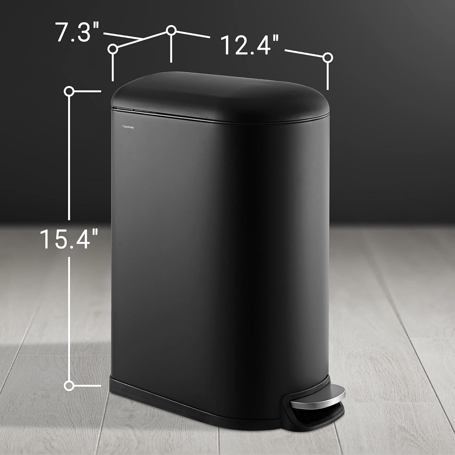 - STYLISH & PRACTICAL DESIGN: happimess Trash Cans clean-lined designs blend beautifully into your existing decor; Dispose of trash hands-free with our convenient step pedal; built-in damper lowers the lid quietly, and closes it tightly to keep odors inside