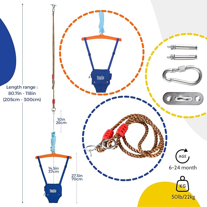 - 【Have a happy childhood】Get ready for endless hours of fun! FUNLIO baby jumper comes with a height-adjustable chain, suitable for toddlers aged 6-24 months. The length of the chain is adjustable to 10in, and your baby can play indoors or outdoors. This set will help infants improve balance and exercise muscles, let your little one enjoy a happy childhood.