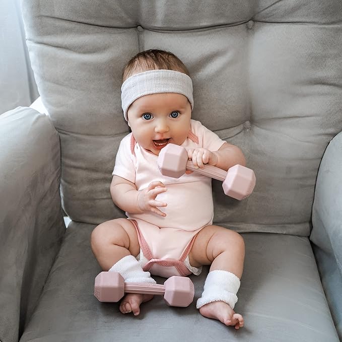 - WORKOUT WITH YOUR BABY BY YOUR SIDE: Turn your precious little one into an enthusiast bodybuilder! Perfectly weighted at about 5oz, the baby workout toys are not too heavy, easy for your baby to grasp and effective practice their muscles while they play.