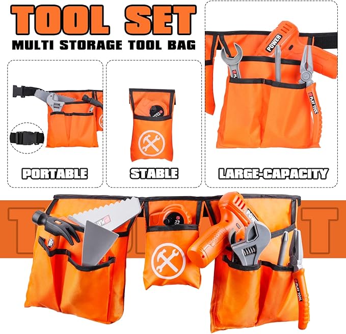- Upgraded Tool Belt for Kids - The kids play tool belt is made of high fiber, high elastic and thick fabric, and is mended with tight stitches. It is also reinforced with multiple top lines, which makes the boys tool belt last longer. The bag has 7 storage Spaces, 2 large Spaces for small parts and 5 for hanging tools accessories.