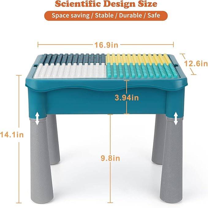 - Special Design for Kids:The building blocks table set are made of high-quality, durable safe plastic, anti-collision arc design at corners and smooth edges to avoid accidental bumps and scratches. The tightness of the building blocks is appropriate, easy to install and disassemble and will not fall off easily. Trapezoidal cylindrical design of kids activity table legs, come with non-slip stickers, more stable. The dimensions of this small kids block table are 16.9" x 12.6" x 14.1" (L*W*H)