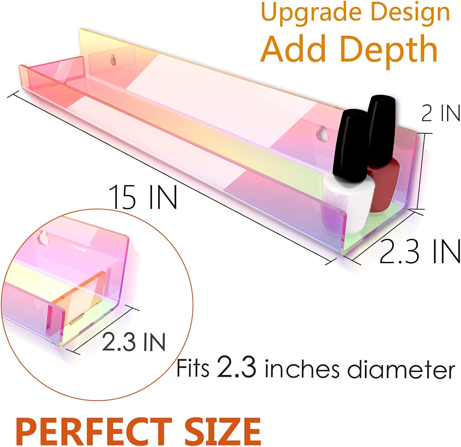- Transform your space with our eye-catching Iridescent Acrylic Shelves. These shelves change color when viewed from different angles, adding a touch of mesmerizing beauty to any room. Say goodbye to bland decor and embrace the vibrant charm of our unique shelves.
