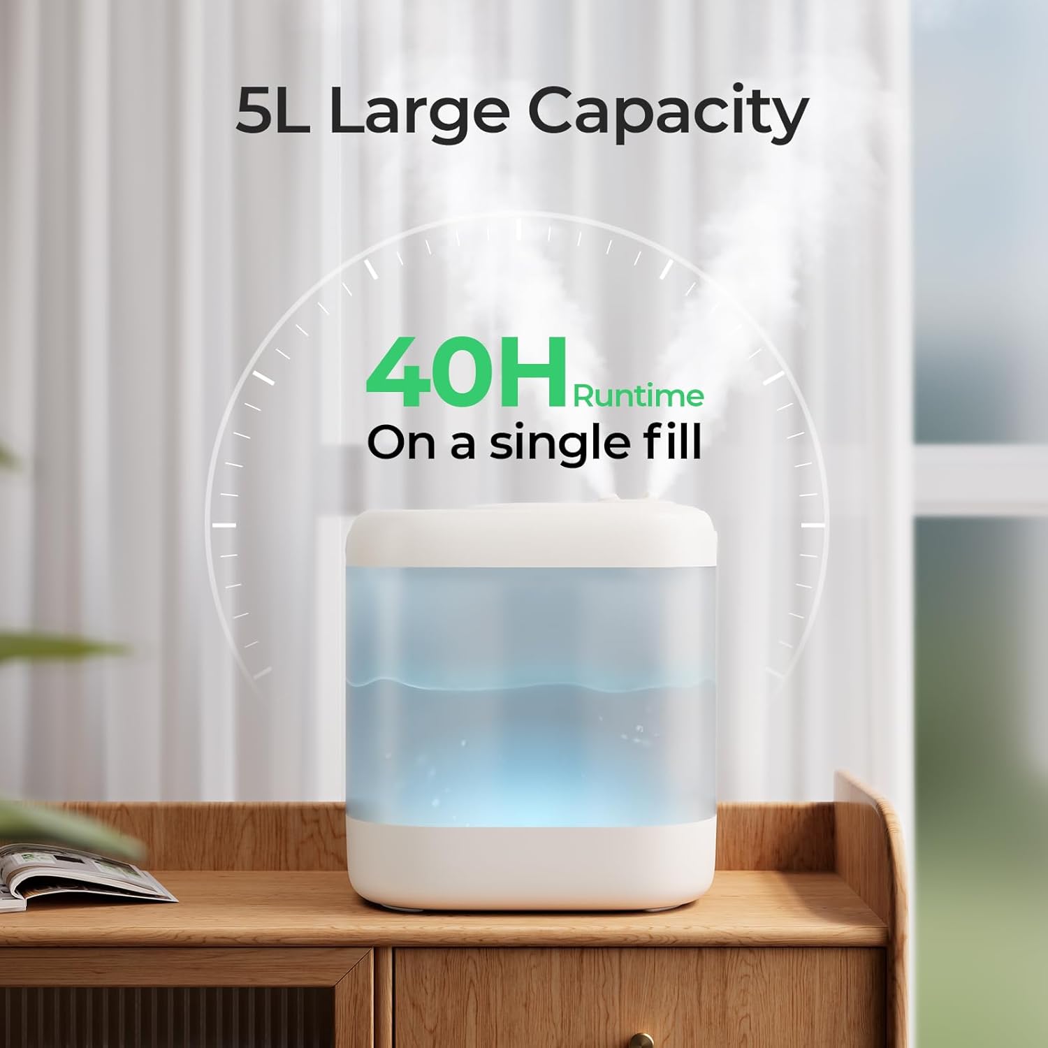 - [Unique Unibody 5L Tank, Less Refill & 100% Leaking Solved] Thanks to the advanced design of the sleek unibody 5L tank, it remains to humidify for up to 40 hours. It solves the leaking issues that have existed in the humidifier industry for a long time: no wet tables, no ruined carpets, and no fuss of frequent refilling or cleaning leaks up. We care not only for you but also for your furniture.