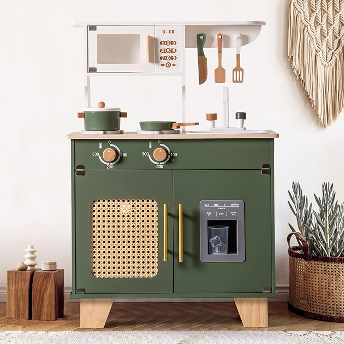 - Realistic Features for Enhanced Play: Experience endless pretend cooking possibilities! This Kids Kitchen Playset includes fun accessories and a unique, working ice dispenser that adds a layer of authenticity, making the Vintage Wooden Play Kitchen truly stand out.