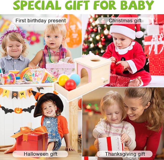 - đăSuitable as a Thoughtful Giftă: The Montessori Object Permanence Box with Tray and Three Balls makes an ideal and thoughtful gift for infants between the ages of 6 to 12 months. Its educational value, coupled with its visually stimulating design, makes it a wonderful present that encourages learning, exploration, and development in young children. The option of a pink door adds a touch of personalization, making it more suitable for girls.