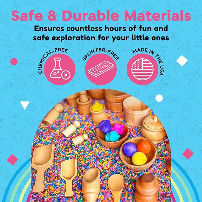 - Handcrafted in the USA: Crafted from premium birch or maple hardwood, these wooden sensory bin tools are built to withstand countless hours of play. You can trust in the exceptional quality of this kids wooden tool set, which is crafted in the USA.
