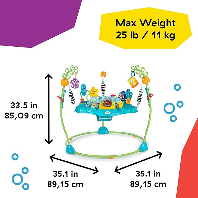 - Jumper features 4 heights that easily adjust to grow with baby; Seat rotates 360 degrees to surround baby with an ocean of learning and exploration; Dimensions: 33.5 x 35.1 x 35.1 inches