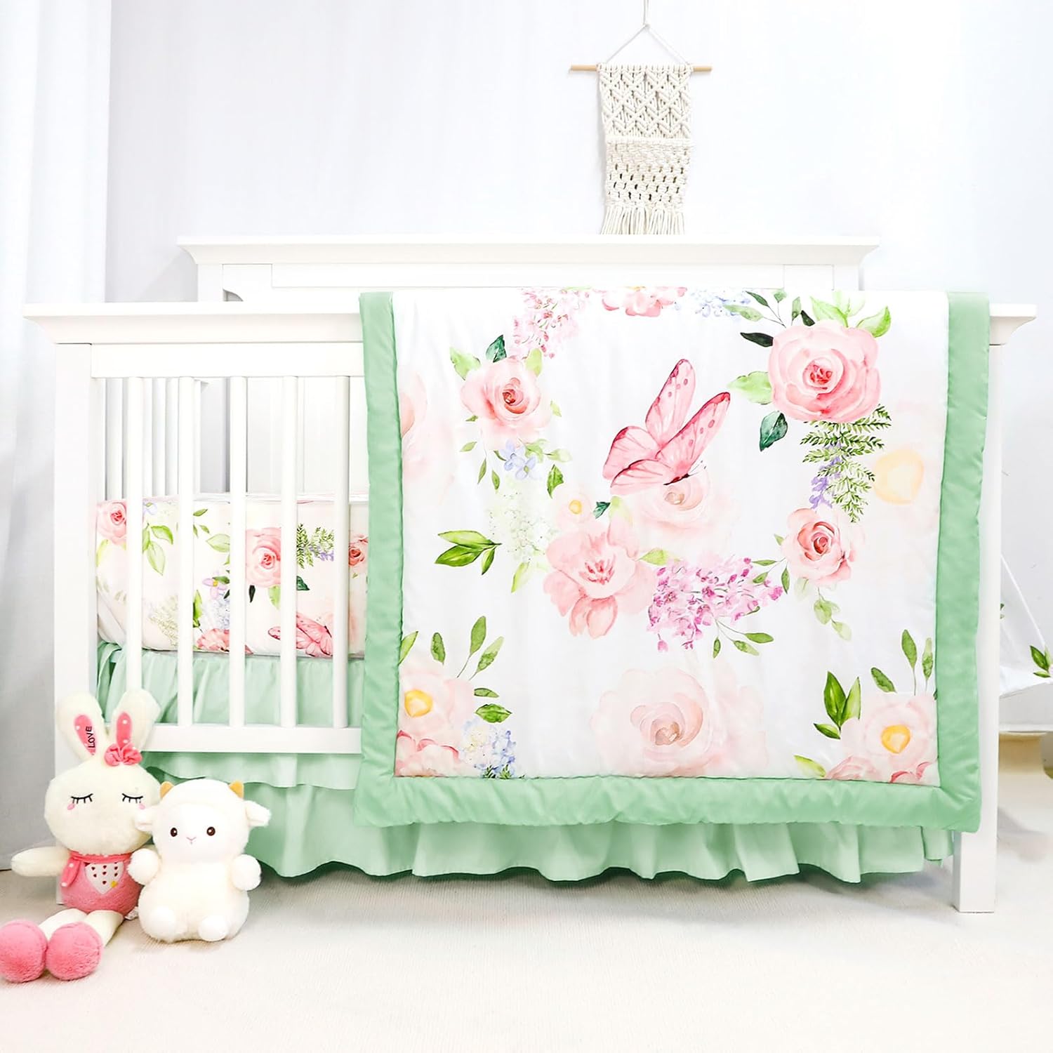 - Green Baby Crib Bedding Set: The comforter is printed with a beautiful butterflies and floral, perfectly matched with the green ruffled crib skirt. This set is perfect for any little girl and will add a lovely ambiance to your nursery