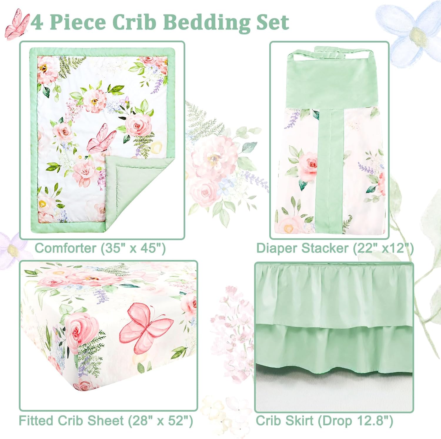 4-Piece Crib Bedding Set, Baby Girl Crib Bedding Set Butterflies Floral Nursery Bedding Set Includes Comforter, Fitted Crib Sheet, Crib Skirt, and Diaper Stacker, Green & Pink