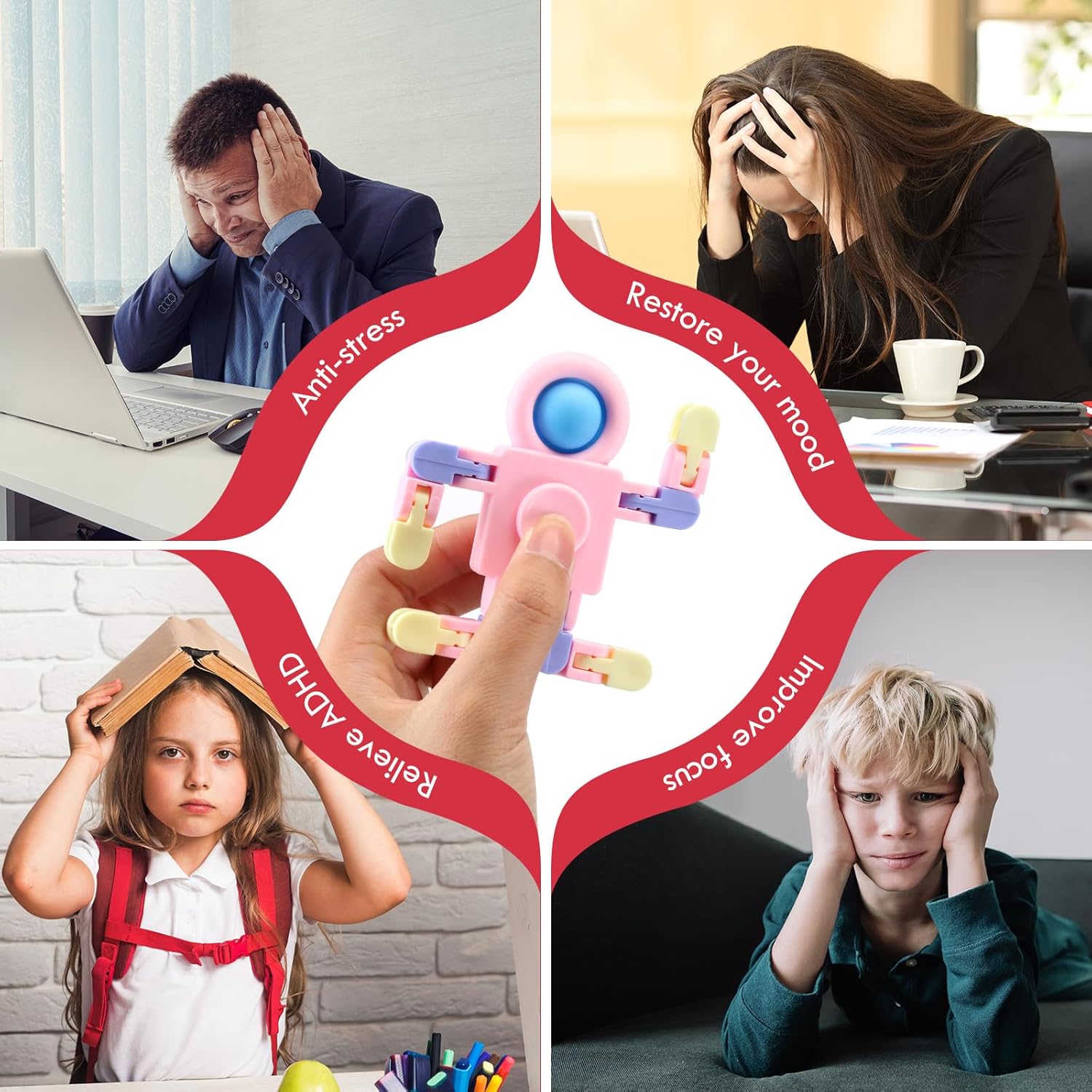 - Anxiety, Stress Relief: the robot fidget spinner adopts a chain buckle design, so it can be deformed and inserted at will, let you play without thinking and let your brain relax and rest; Easy to play, when you press the bubble on the head of robot, it will make a bang, hold the chest of the robot and let it spin freely; It helps to relieve your stress after work and study, and built better habits in your life; Say goodbye to bad habits such as smoking or nail biting