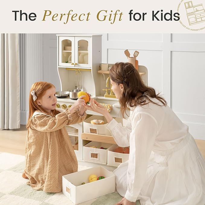 • Safe, Durable, and Stylish Wooden Build: Made with premium wood and child-safe finishes, this toddler play kitchen meets ASTM F963 and EN-71 safety standards. Modern home-style design blends beautifully with any room while offering long-lasting play value.