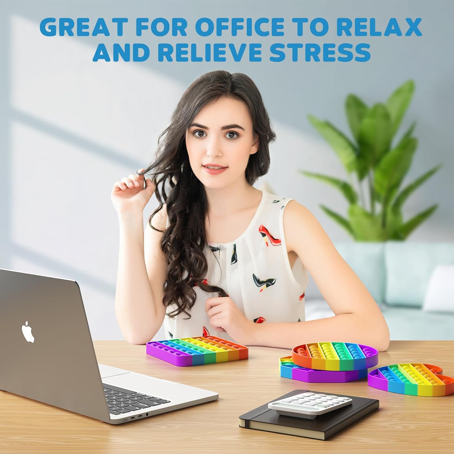 - 【Stress & Anxiety Reducing Toy】Whether it is accumulated stress or anxiety due to work, study or other causes,our push pop bubble fidget sensory toy will help you get relief.it creates a satisfying popping sound that soothes your ears,and the soft silicone texture of each pop has a pampering effect on your fingertips, helping to relax your mind and body,eliminate stress and anxiety! when all the bubbles on the front are squeezed, then flip it over and start again. Give you endlessly fun.