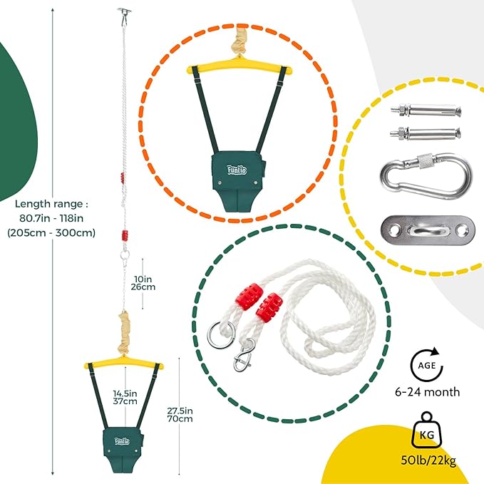 - 【Have a happy childhood】Get ready for endless hours of fun! FUNLIO baby jumper comes with a height-adjustable chain, suitable for toddlers aged 6-24 months. The length of the chain is adjustable to 10in, and your baby can play indoors or outdoors. This set will help infants improve balance and exercise muscles, let your little one enjoy a happy childhood.