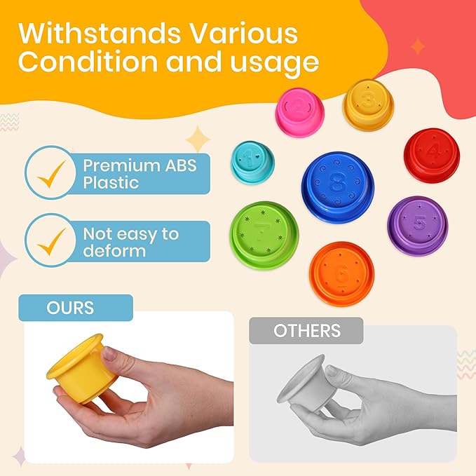 - DURABLE & SAFE – Our toddler stacking cups are manufactured with high-quality, BPA-free, non-toxic materials to ensure your child's safety. These stack cups form an excellent and secure playtime companion being the perfect stackable cups for babies, they are designed with utmost care to be both enjoyable and safe.