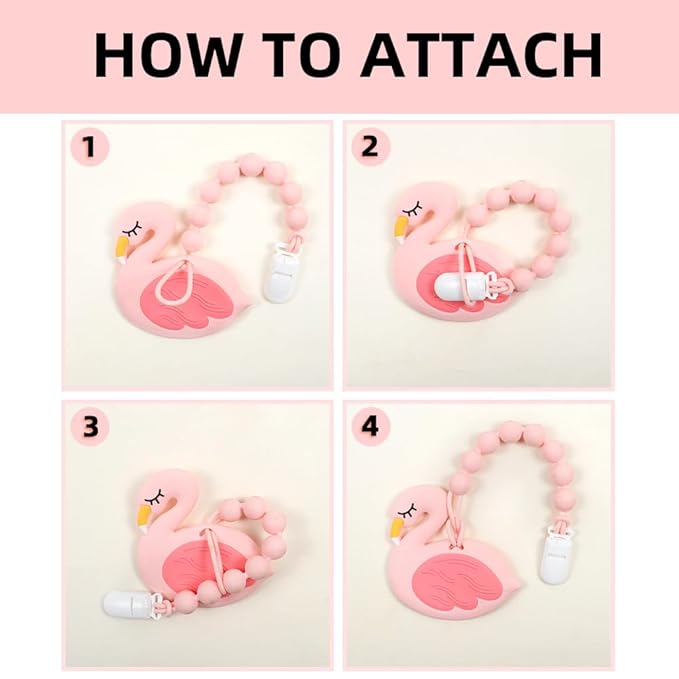 Baby Food Grade Silicone Teether Toy with Pacifier Clip Holder,Teething Toys Gift Set for 3 Months+ Boys and Girls,Freezer Safe,BPA Free. (Pink Flamingo)