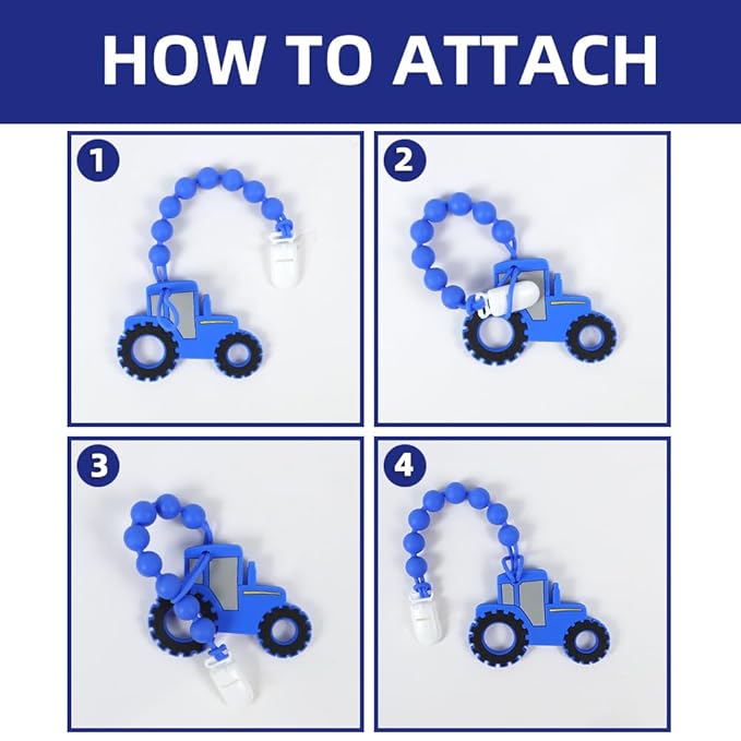 Baby Food Grade Silicone Tractor Truck Teether Toy with Pacifier Clip Holder,Teething Toys Gift Set for 3 Months+ Boys and Girls,Freezer Safe,BPA Free. (Blue)