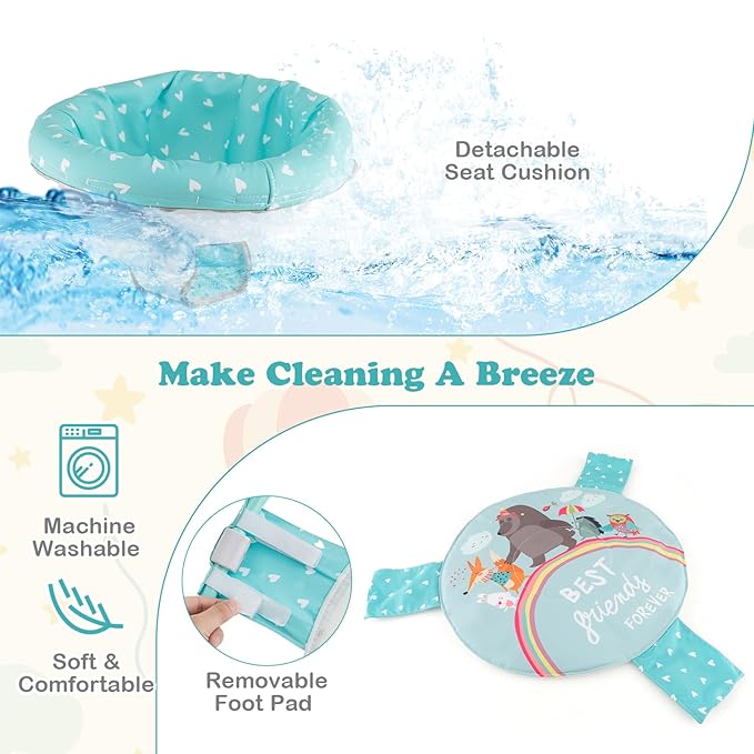 - 【Make Cleaning A Breeze】The detachable toys are easy to wipe down. Plus, the detachable seat cushion and removable foot pad are machine washable, saving your precious time and energy. When not using it, you can disassemble the baby activity chair for convenient storage.