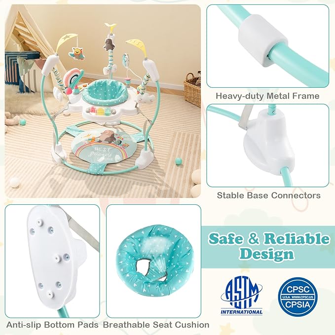 - 【Safe & Reliable Design】Made of heavy-duty metal frame with stable base connectors, the baby play center well withstands baby's constant jumping or bouncing. The anti-slip bottom pads add overall safety. Additionally, the padded seat cushion is soft and breathable, so that infants can comfortably sit in. ASTM and CPSIA certification makes the activity center more trustworthy.