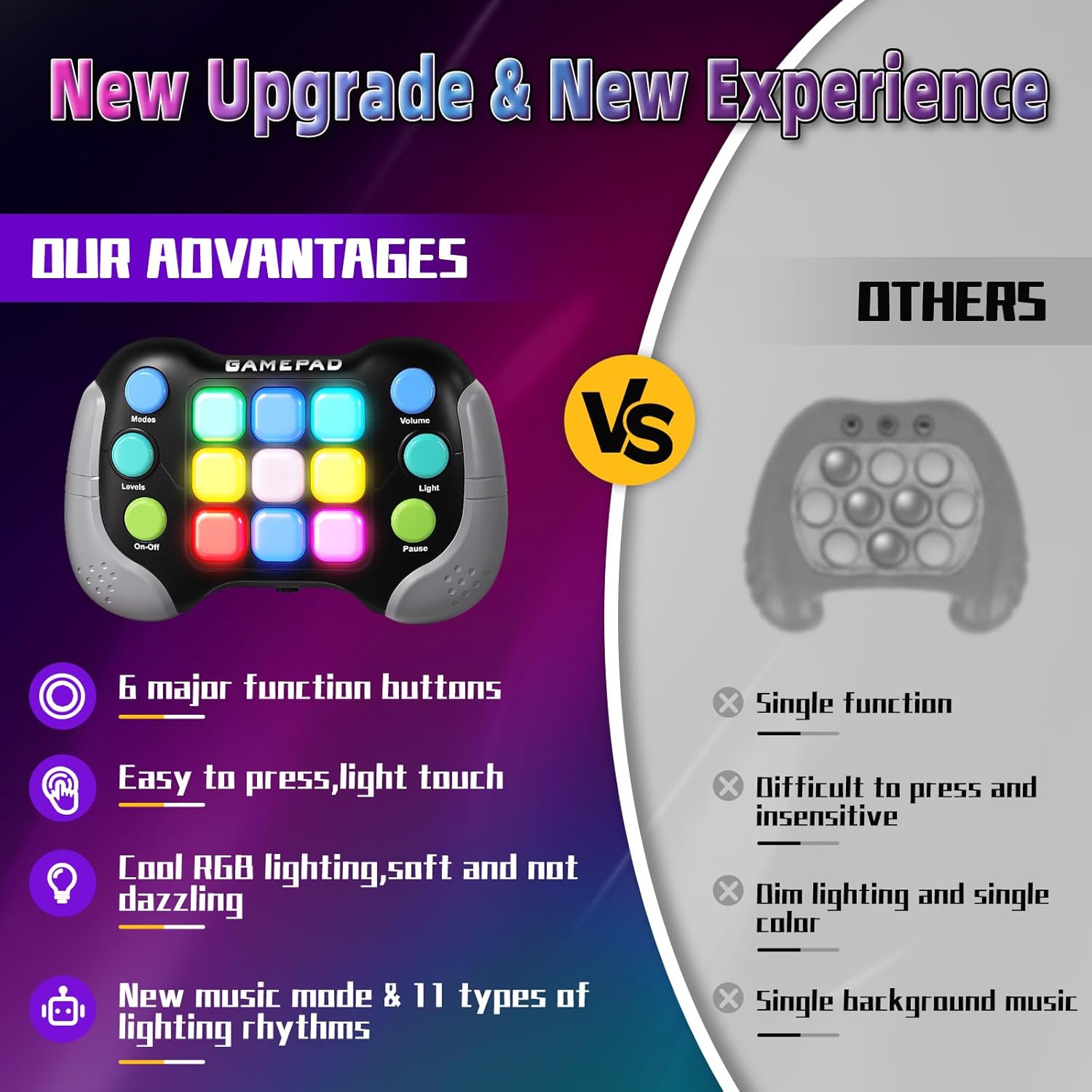 - 【2024 Newest Fast Push Gamepad】Upgrade 999 levels to bring more challenges to players! Let players think positively and react quickly in the challenging levels!Upgraded RGB ambient light with 7 colors to enhance players' visual experience.Soft eye protection without flicker, dark light environment can also play!