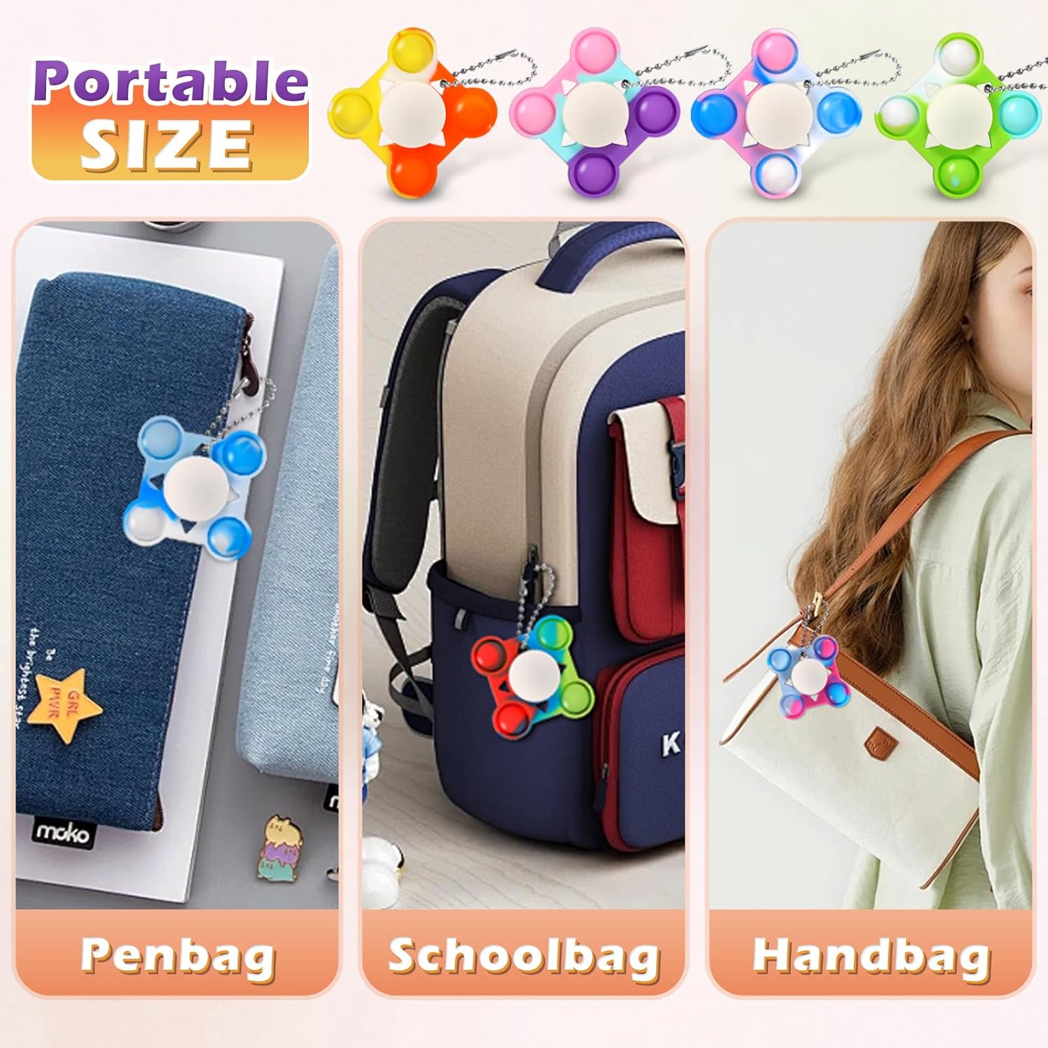- Easy to carry-The pop Spinners keychains use of hanging hole design, more convenient to carry.You can hang the chain on your keys, backpack, pencil case, cell phone, or even on birthday cards, thank you cards, Valentine's Day, Easter, New Year's cards, and Christmas cards.