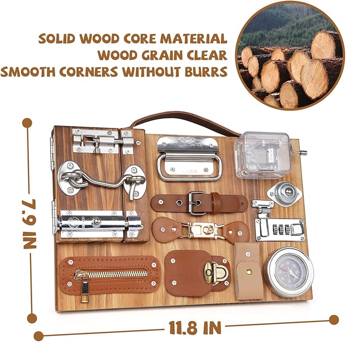 - Montessori-inspired Design: Featuring 12 activities including latches, switches, gears, locks, zippers, and buttons, our Montessori busy board helps children recognize and interact with everyday objects, promoting practical life skills and cognitive development.