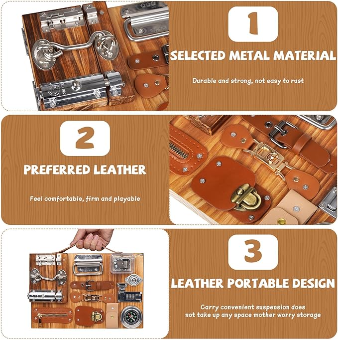 - Safety and Durability: Crafted from high-quality smooth wooden materials, our Montessori busy board prioritizes safety. With sturdy edges and secure elements, parents can trust that their toddlers can play safely and confidently.