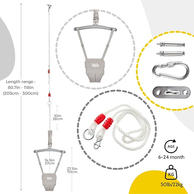 - 【Have a happy childhood】Get ready for endless hours of fun! FUNLIO baby jumper comes with a height-adjustable chain, suitable for toddlers aged 6-24 months. The length of the chain is adjustable to 10in, and your baby can play indoors or outdoors. This set will help infants improve balance and exercise muscles, let your little one enjoy a happy childhood.