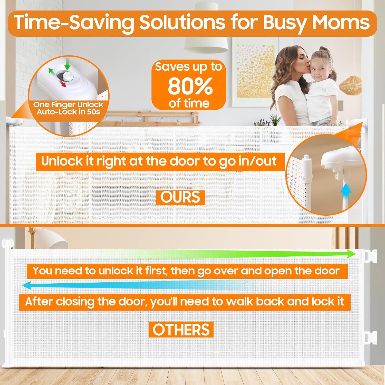 - 【Specially Designed for Busy Moms】We have 2 locking mechanisms. One is a mesh locking mechanism that automatically locks after a countdown timer, and also controls the extension and retraction of the mesh. The other is a gate locking mechanism - simply unlock the gate right where you are, and the gate will open. And the gate will automatically lock when closed, for quick and easy access. Unlike other baby gates, you don't have to go through a multi-step process of unlocking the mesh, then opening the gate, and finally remembering to lock the mesh again. Our baby gate saves you that hassle.