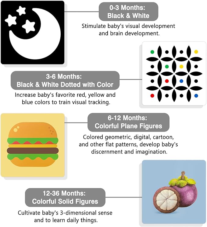 - Visual Training -- 0-3 months, black & white cards, stimulate baby's visual development and brain development; 3-6 months, black & white cards, increase red, yellow and blue colors to train visual tracking; 6-12 months, colorful plane figures, develop baby's discernment and imagination; 12-36 months, colorful solid figures, cultivate baby's 3-dimensional sense and to learn daily things.
