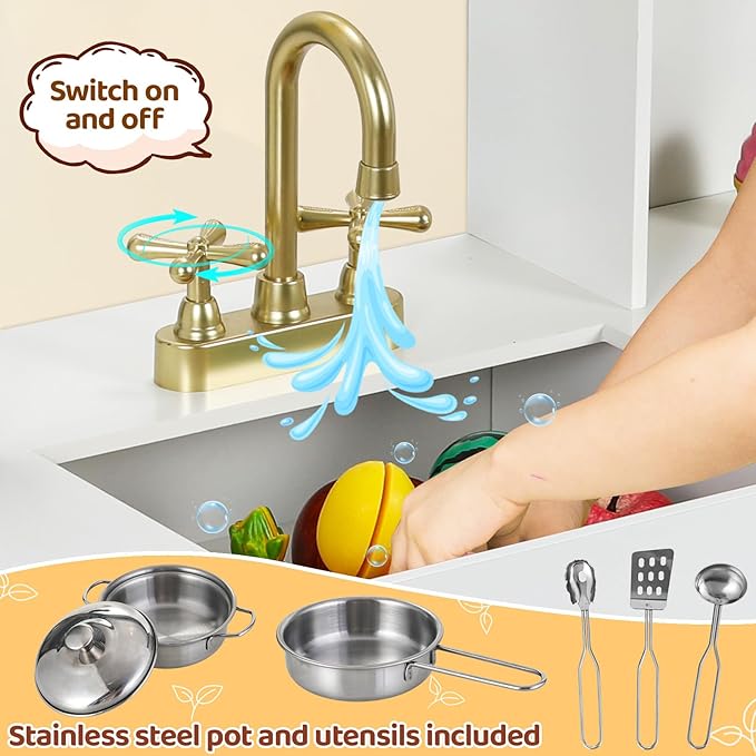 - SAFE MATERIALS: Kid's play kitchen set is made of sturdy MDF material. With ASTM & CPSIA safety testing. Kitchen toy set is painted with child-friendly paint, allowing kids to play without worries. Smooth round edges ensure the safety of toddlers, effectively preventing bumps and scratches during play.
