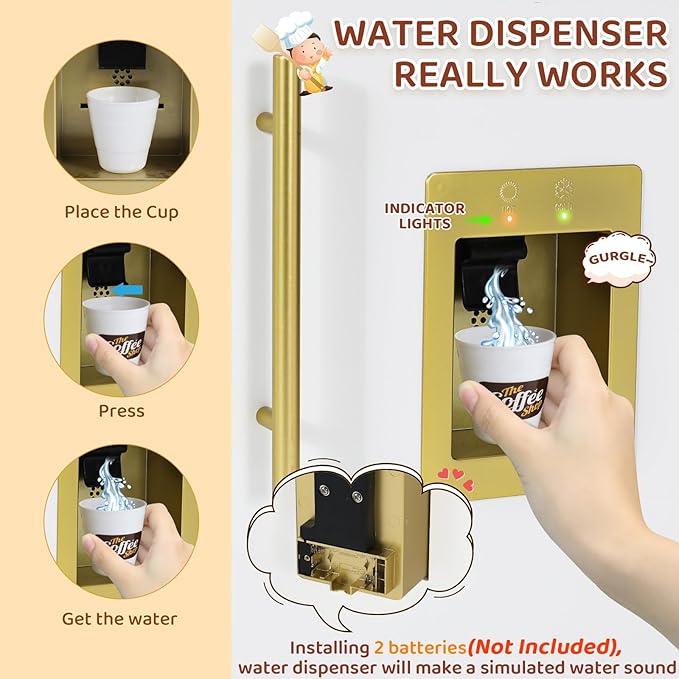 - REALISTIC LIGHTS & SOUNDS: Wooden kitchen playset has a battery-operated stove and water dispenser. When you press red button on stove, pretend burners automatically light up and make frying and boiling sounds! Press water dispenser switch and indicator light will come on, along with sound of running water. All knobs make a clicking sound when turned. (Batteries purchased extra.)