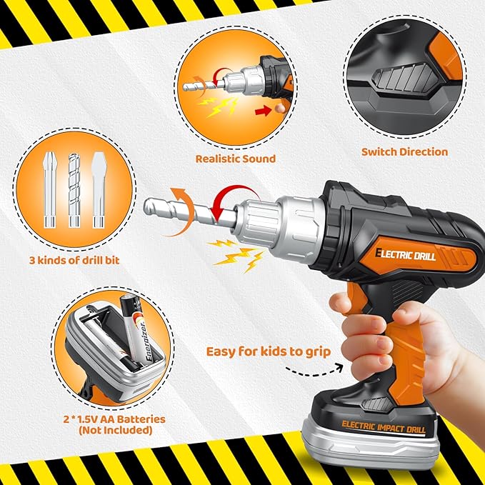 - Realistic Tool Drill Set for Kids: This toddler tool set with drill is functional and realistic.The toy electric drill comes with 3 kinds of drill bits. Press the switch to start the toy drill, you can hear buzzing sound like a real drill. There’s a button on the side to make the drill rotated left and right, making it even more realistic and fun. Nice toys for toddlers age 3,4,5,6, let kids immerse in the handyman role play with the tool toys and develop imagination