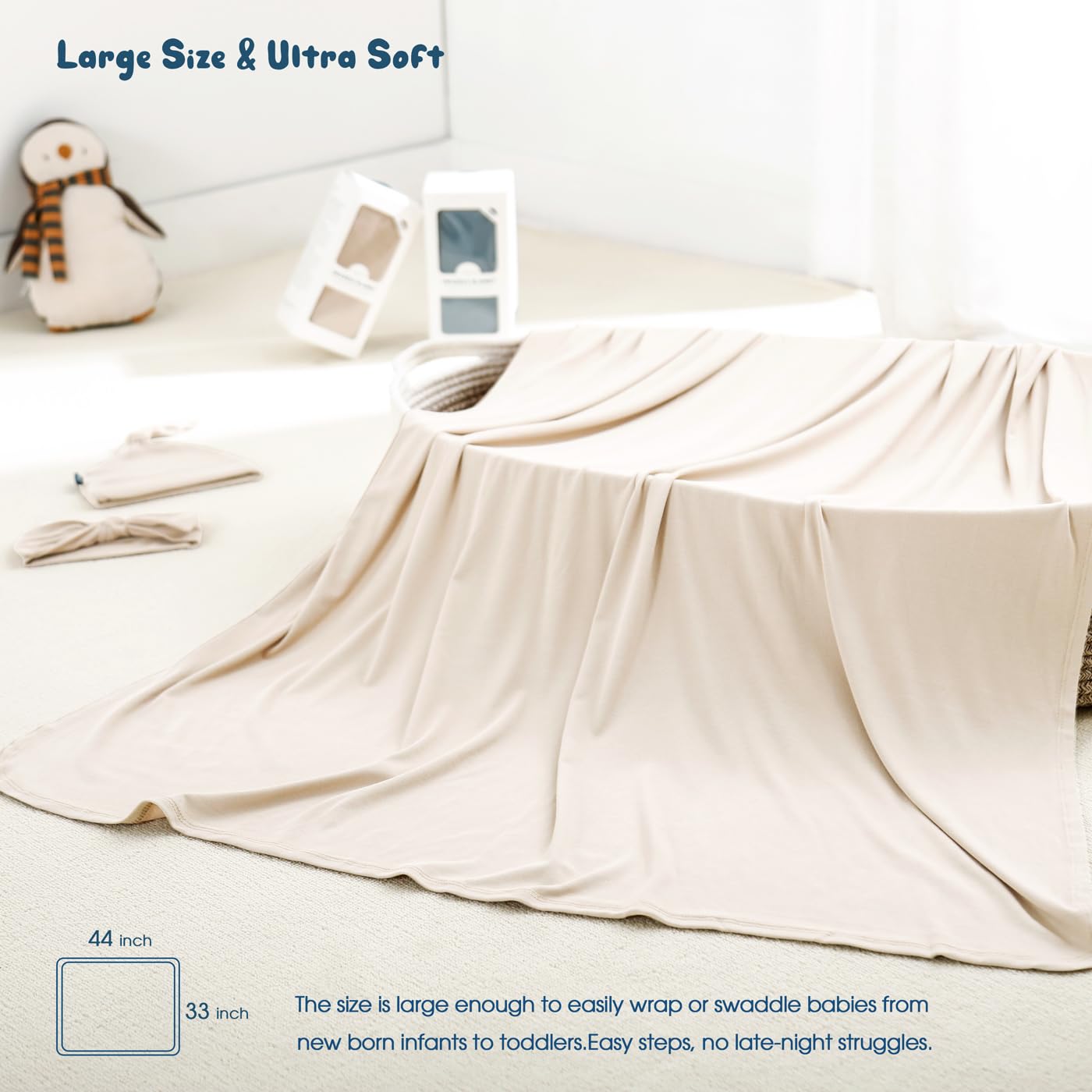 GRSSDER Newborn Swaddle Blanket, Ultra Soft Jersey Receiving Blanket with Matching Headband and Beanie Set 33×44", Stretchy Baby Neutral Swaddle Wrap for Girls and Boys