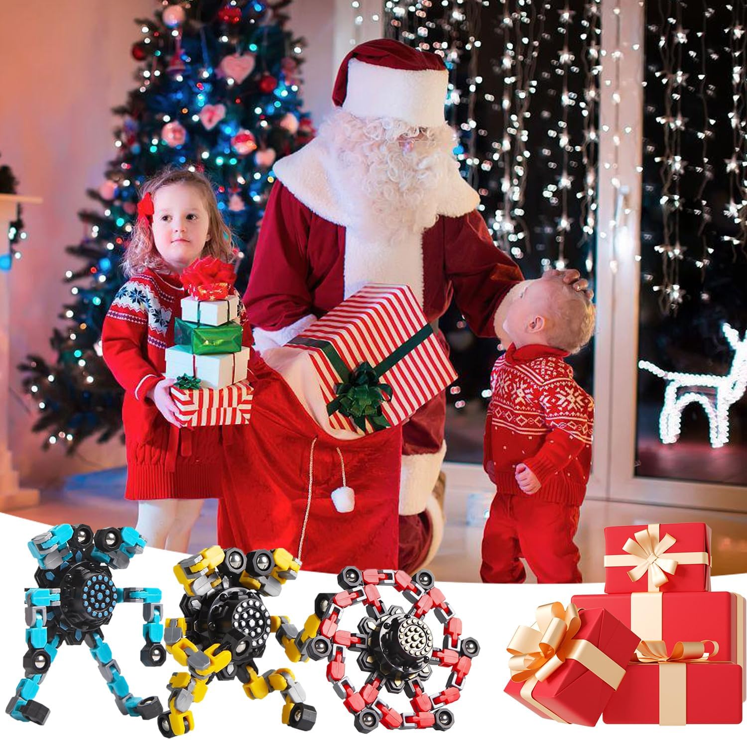 - 【Transformable Finger Gyros】Each fidget spinner features six deformable chains, allowing you to create various shapes such as spinners, robots, and even phone holders. This not only provides fun but also enhances kids' hands-on ability, hand-eye coordination, and logical thinking skills.