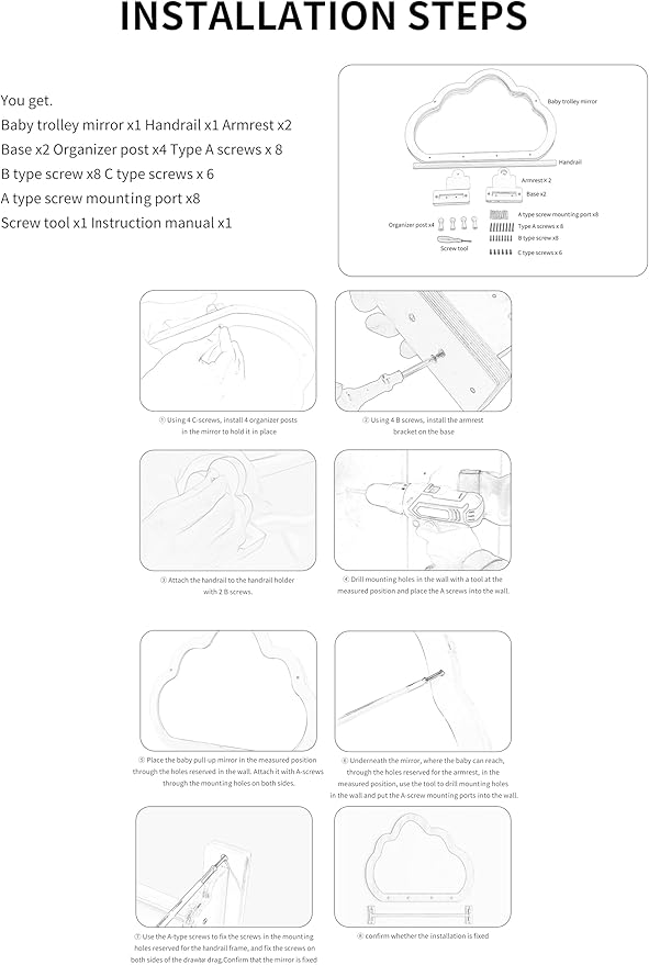 - Safety First Design: The baby pull up bar and mirror are securely fastened with wall anchors and screws, ensuring stability and preventing falls. The sturdy construction supports your baby as they practice standing and balancing, prioritizing your child's safety.And the pull-up bar are equipped with anti-rotation grooves to prevent it from turning and causing falls, ensure secure and worry-free use.