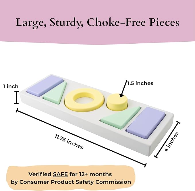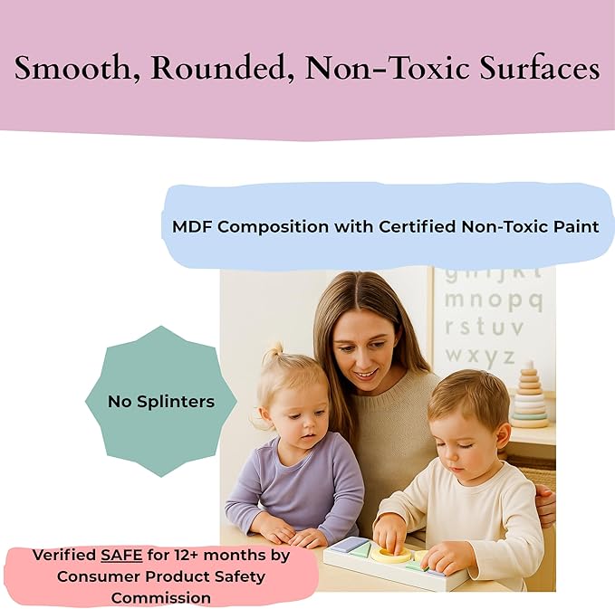 - CERTIFIED CHILD-SAFE: Certified safe for young children by a Consumer Safety Products Commission-verified testing laboratory, the durable wood shape sorter toy does not contain small parts among the base or six puzzle pieces. The pieces are too large for any child to swallow; the smallest piece is 1.5 inches in diameter. All edges and rounded and smooth, meaning the item will not produce splinters. It makes a great toy and shape sorters for toddlers 1-3.