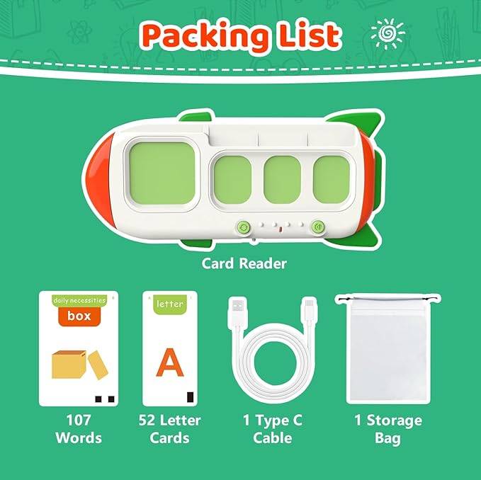 - [ Advanced Learning Experience ] ---- Different with the traditional wooden CVC word spelling games, this talking flash card set provides a more interactive & attractive learning experience. Either a word card or letter card is inserted, the card reader will read it, making learning much more interactive & fun.
