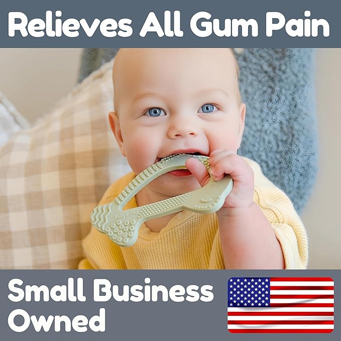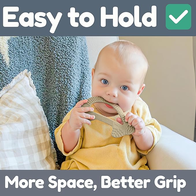 - 100% safe, BPA-free silicone: Our silicone baby teether, available in Aqua Mint, Blueberry, Olive, and Bubblegum, is free from harmful substances and thoroughly tested to provide peace of mind for parents. Crafted from food-grade silicone, this non-toxic teething toy guarantees a safe chewing experience for your little one.