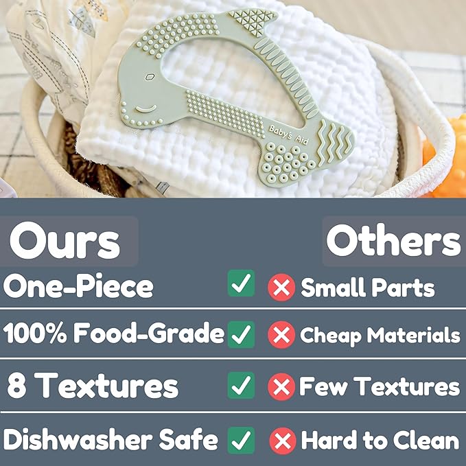 - Dolphin baby teether for pain relief: Designed with 8X teething relief textures, this dolphin-shaped teething toy gently massages sore gums, providing the ideal baby chew toy for infants and toddlers. It’s perfect for babies 3+ months, offering lasting comfort and effectively soothing discomfort.