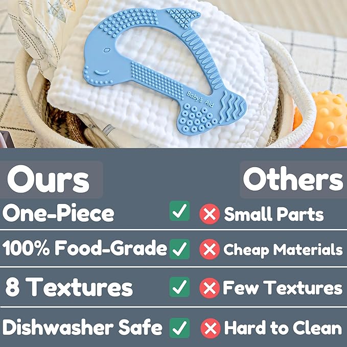 - Dolphin baby teether for pain relief: Designed with 8X teething relief textures, this dolphin-shaped teething toy gently massages sore gums, providing the ideal baby chew toy for infants and toddlers. It’s perfect for babies 3+ months, offering lasting comfort and effectively soothing discomfort.