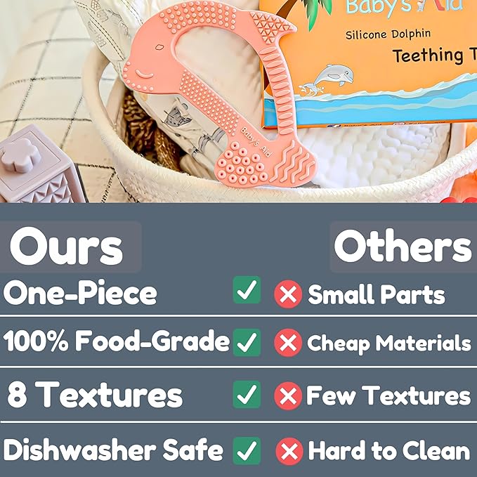 - Dolphin baby teether for pain relief: Designed with 8X teething relief textures, this dolphin-shaped teething toy gently massages sore gums, providing the ideal baby chew toy for infants and toddlers. It’s perfect for babies 3+ months, offering lasting comfort and effectively soothing discomfort.