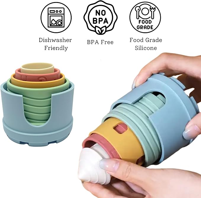 Castle Stacking Tower & Nesting Cups Baby Toys - 5-Piece Silicone Teething & Bathing Set - Fun, Educational & Early Learning Gift for Babies 6+ Months - BPA Free, Soft & Dishwasher Safe