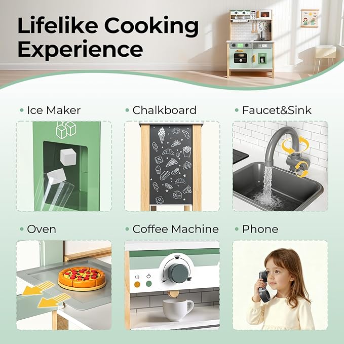 - Complete Set to Play Immediately: This toy kitchen set comes with 35 pcs accessories, including a chef hat, apron, play pots and pans, utensils, wooden food slicings, cups, ice cubes, etc. Everything your child needs is included.